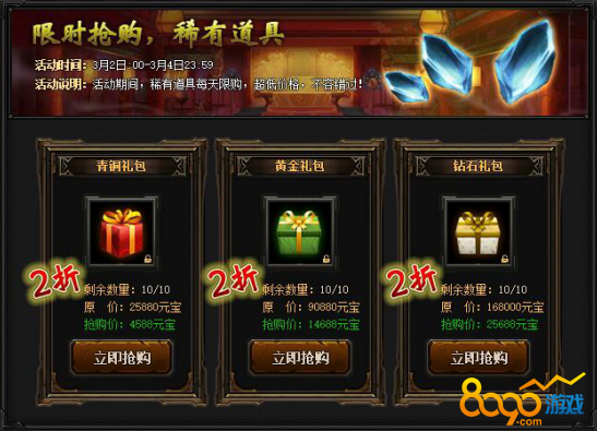 【活动内容】活动期间,玩家可在活动界面限时抢购稀有道具,超低价格,不容错过!(活动期间每天限购10次)