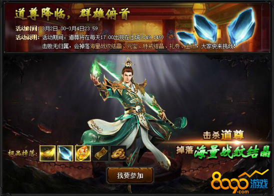 【活动内容】活动期间,道尊将在每天17:00出现在土城(149.145),击杀道尊将会掉落海量战纹碎片、元宝、礼券、特戒结晶,大家快来打道尊!(注:道尊掉落无归属)