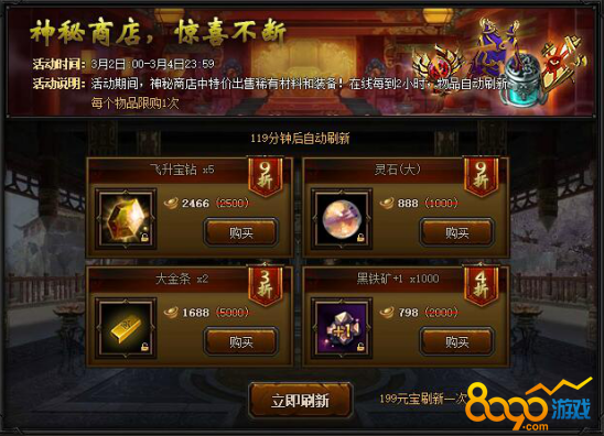 【活动内容】活动期间,神秘商店限时开启,稀有材料超低价格出售,不容错过!每过2小时,商店物品自动刷新,消耗199元宝可立即刷新,每个物品限购一次。