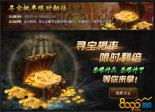 【活动内容】活动期间,城主宝藏寻宝概率限时翻倍,荣耀神兵、荣耀神甲等你来拿!