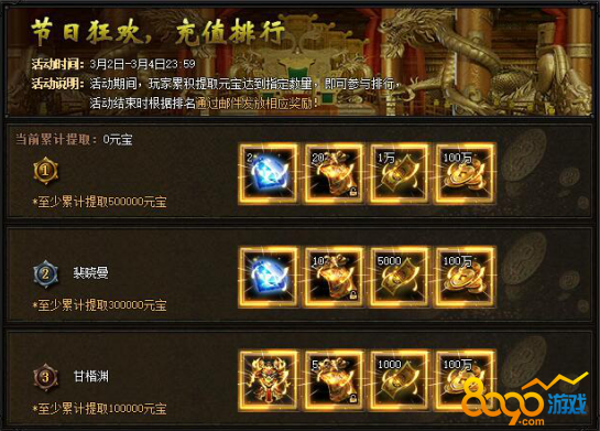 【活动内容】活动期间,累计充值达到指定金额即可参与排行,活动结束后,排名前三的玩家可获得超值排行大奖!