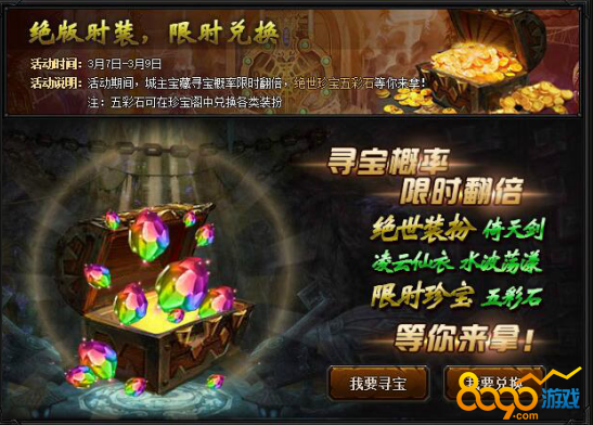 【活动内容】活动期间,城主宝藏寻宝概率限时翻倍,绝世珍宝五彩石等你来拿!