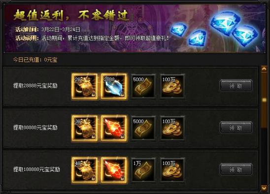 【活动内容】活动期间,累计充值达到指定金额,即可领取超值豪礼!