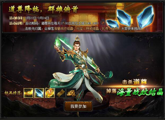 【活动内容】活动期间,道尊将在每天17:00出现在土城(149.145),击杀道尊将会掉落海量战纹碎片、元宝、礼券、特戒结晶,大家快来打道尊!(注:道尊掉落无归属)