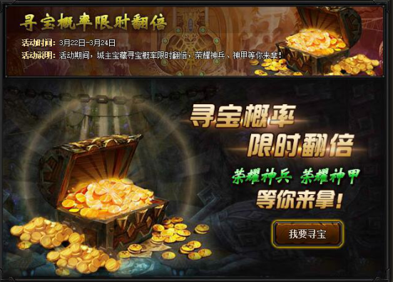 【活动内容】活动期间,城主宝藏寻宝概率限时翻倍,荣耀神兵、荣耀神甲、荣耀战纹等你来拿!