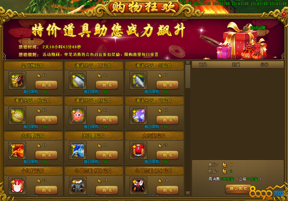 活动规则:活动期间内,在活动界面单笔消费将会有对应折扣奖励,限购的数量每日重置。