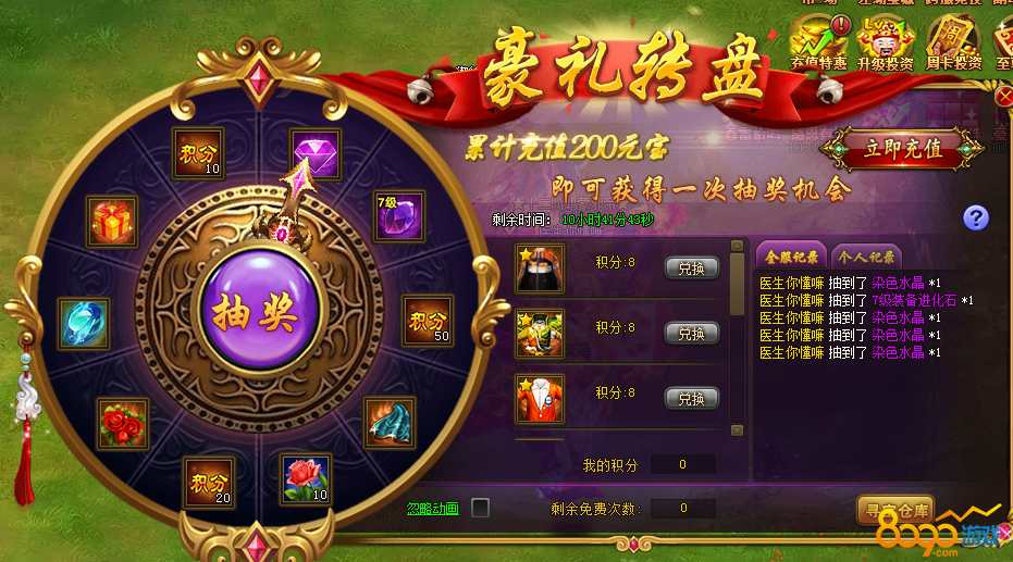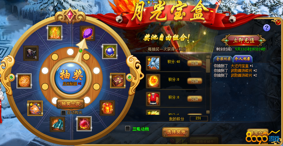 活动规则:活动期间内,玩家每累计充值200元宝,即可获得一次抽奖机会,抽奖可获得珍贵道具和积分,积分可额外兑换稀有道具。