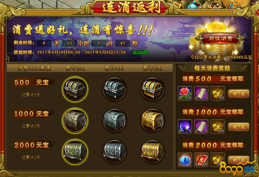 活动规则: 活动时间内,每天消费指定金额即可领取对应奖励,指定金额消费累计指定天数即可领取对应天数的奖励;活动期间内累计消费天数不会重置,活动结束后,未领取的奖励视为放弃领取;每天消费奖励须当日领取,当日未领取视为自动放弃。