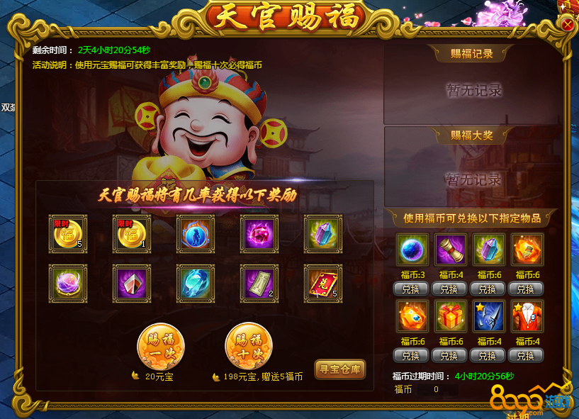 活动规则:活动期间内,玩家消耗一定量元宝来进行赐福,赐福一次消耗20元宝,赐福十次必定获得5福币, 除去赐福获得的奖励道具外,福币可额外兑换稀有道具,福币每天24:00清空,玩家赐福获得的道具会放置在玩家寻宝仓库内,福币兑换的道具则直接进入玩家背包。