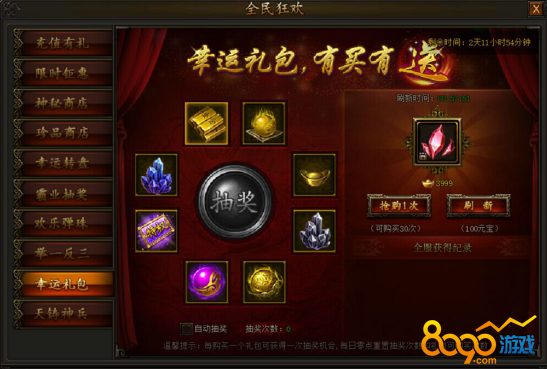 活动期间,每购买一次礼包可获得一次抽奖机会,还可花费元宝进行刷新!抽奖次数和礼包购买次数每日零点清零,请及时抽奖。