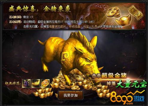 【活动内容】活动期间,超级金猪将在每天17:00出现在盟重要塞(149.145),击杀超级金猪将会掉落海量材料、元宝、礼券、特戒结晶,大家快来抢金猪!(注:金猪掉落无归属)