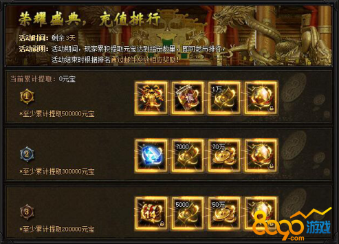 【活动内容】活动期间,每天只要充值达到2000元宝,即可领取荣耀盛典超值礼包!