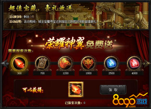 【活动内容】活动期间,城主宝藏寻宝达到指定次数即可领取超值豪礼!