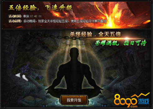 【活动内容】活动期间,全服双倍经验活动全天开启,所有玩家击杀怪物获得的经验翻倍,海量经验轻松获得!(使用多倍经验符效果可叠加)