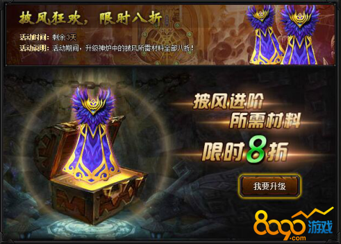 【活动内容】活动期间,升级神炉中的披风所需材料限时八折优惠!