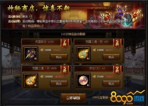【活动内容】活动期间,神秘商店限时开启,稀有材料超低价格出售,不容错过!每过2小时,商店物品自动刷新,消耗199元宝可立即刷新,每个物品限购一次。