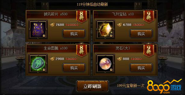 【活动内容】活动期间,神秘商店限时开启,稀有材料超低价格出售,不容错过!每过2小时,商店物品自动刷新,消耗199元宝可立即刷新,每个物品限购一次。