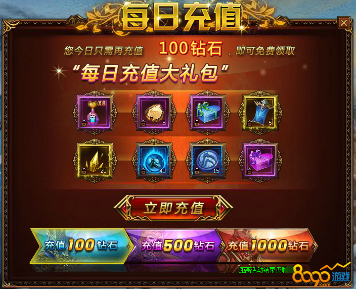 活动期间,每日累计充值分别达到100钻、500钻、1000钻,均可领取丰厚奖励;