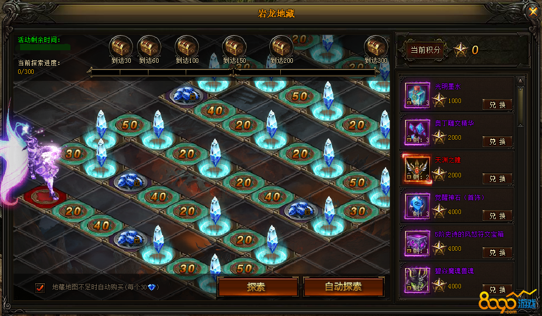 1、活动期间,玩家可以通过每次花费30钻石进行探索获得积分,探索的过程中有几率获得珍贵的道具奖励或者大额积分,探索达到一定的进度必定获得大量的积分奖励;
