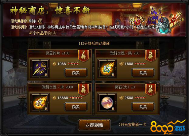 【活动内容】活动期间,神秘商店限时开启,稀有材料超低价格出售,不容错过!每过2小时,商店物品自动刷新,消耗199元宝可立即刷新,每个物品限购一次。