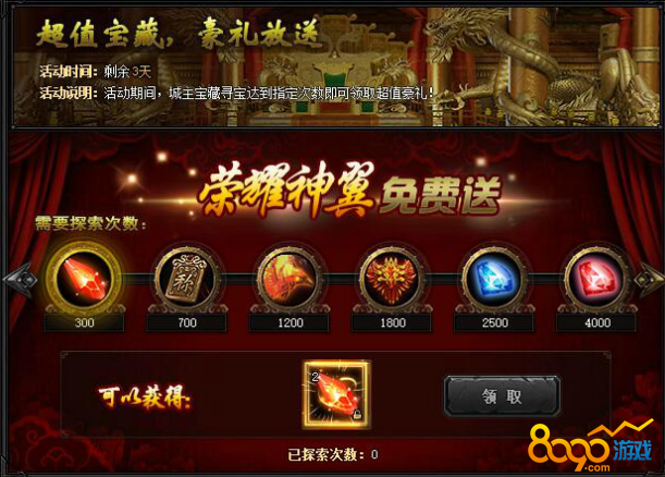 【活动内容】活动期间,城主宝藏寻宝达到指定次数即可领取超值豪礼!