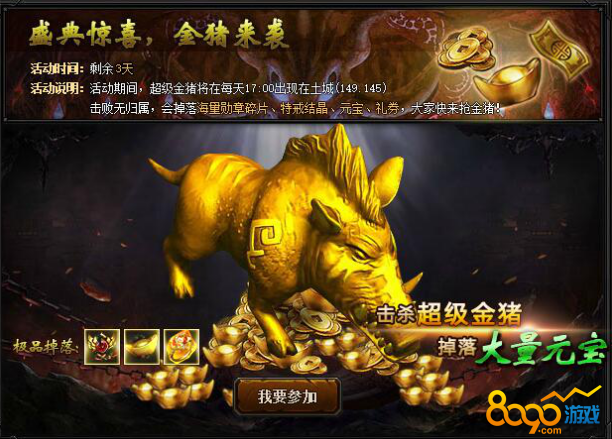 【活动内容】活动期间,超级金猪将在每天17:00出现在盟重要塞(149.145),击杀超级金猪将会掉落海量材料、元宝、礼券、特戒结晶,大家快来抢金猪!(注:金猪掉落无归属)