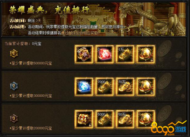 【活动内容】活动期间,每天只要充值达到2000元宝,即可领取荣耀盛典超值礼包!
