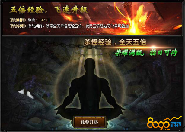 【活动内容】活动期间,全服双倍经验活动全天开启,所有玩家击杀怪物获得的经验翻倍,海量经验轻松获得!(使用多倍经验符效果可叠加)