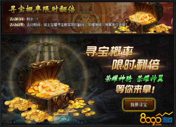 【活动内容】活动期间,城主宝藏寻宝概率限时翻倍,荣耀神骑、荣耀神翼、荣耀配饰等你来拿!