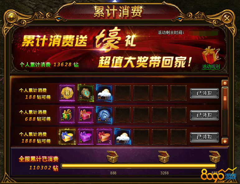 2、活动期间全服总消费每达到一定额度后,所有人均可获得一份免费大礼包。