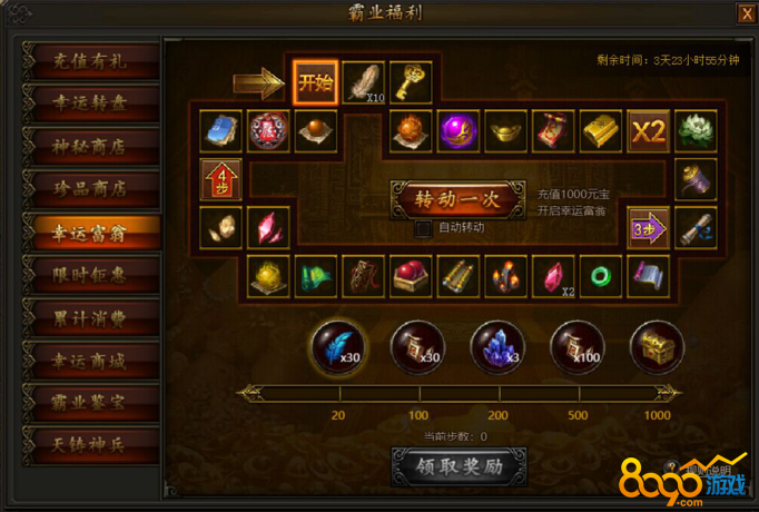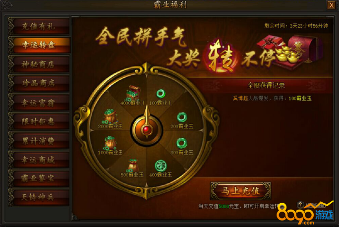 活动期间,充值并消费一定元宝即可使用幸运转盘,获得大量霸业玉道具,使用霸业玉后即可前往霸业商城内购买珍稀道具,精彩不容错过。