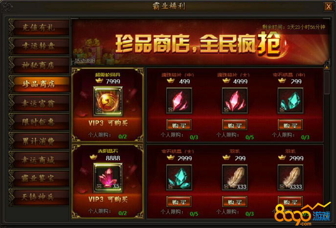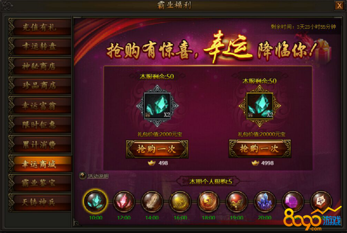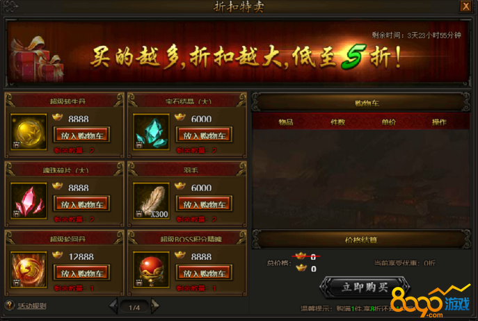 活动期间,每天会随机刷新一批特价道具,花费少量元宝即可购买,每个道具均有每天最大个人购买次数限制,部分道具有购买vip等级限制,买到就是赚到,机会不容错过!