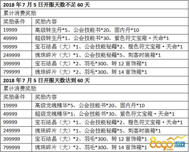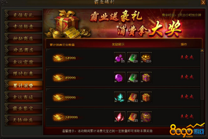 活动期间,累计消费一定数量元宝,即可领取对应档奖励,每个角色只能领取一次。