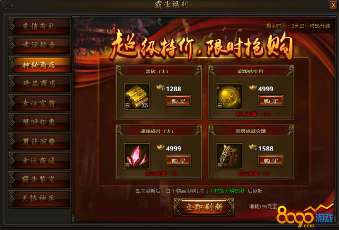 活动期间,每两小时神秘商店会自动刷新一批道具,也可花费元宝立即刷新,大量道具限时等你抢购。