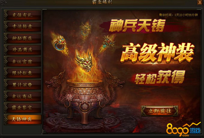 活动期间,天铸神兵限时出现在比奇城,投入低级神装,花费少量元宝即有机会获得更高级神装,从此快人一步,集齐高阶神装不是梦!