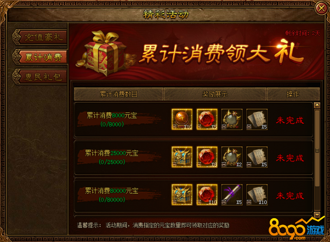 活动内容:活动期间达到累计消费元宝数即可领取大量超值奖励!