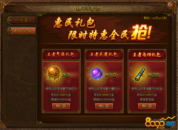 活动内容:活动期间特惠礼包共会出现3种不同的礼包,每种礼包可购买3个档次