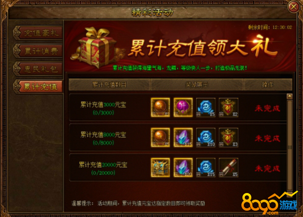 活动内容:活动期间达到累计充值即可领取大量超值奖励!