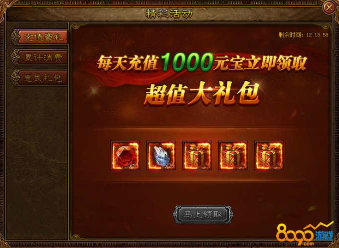 活动内容:活动期间每天充值1000元宝可获得大量超值奖励!