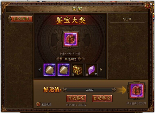 活动内容:活动期间内,消耗200元宝可进行鉴宝,每次鉴宝好运值+10,好运值达到指定要求时必定兑出大奖——称号·三杀乐队。