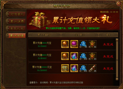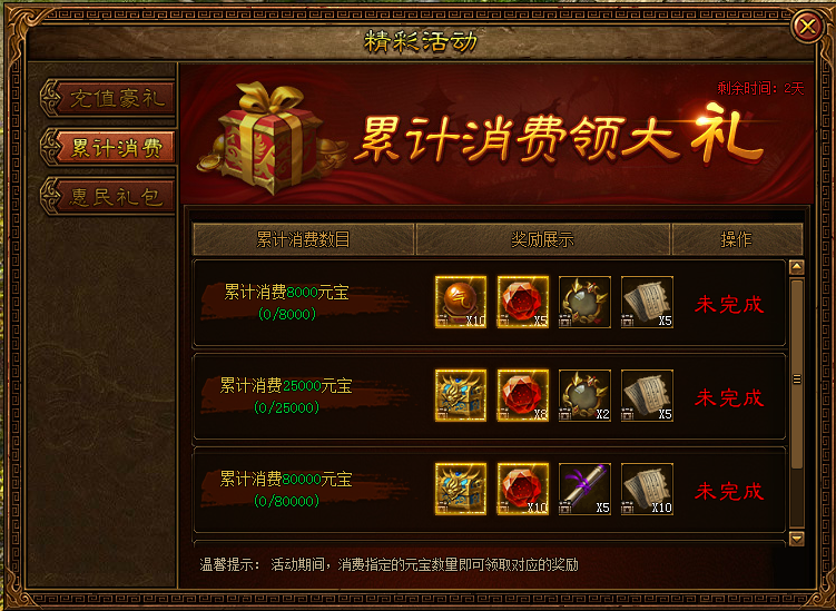 活动内容:活动期间达到累计消费元宝数即可领取大量超值奖励!
