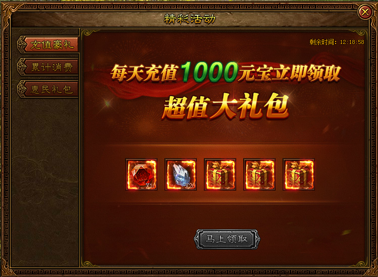 活动内容:活动期间每天充值1000元宝可获得大量超值奖励!