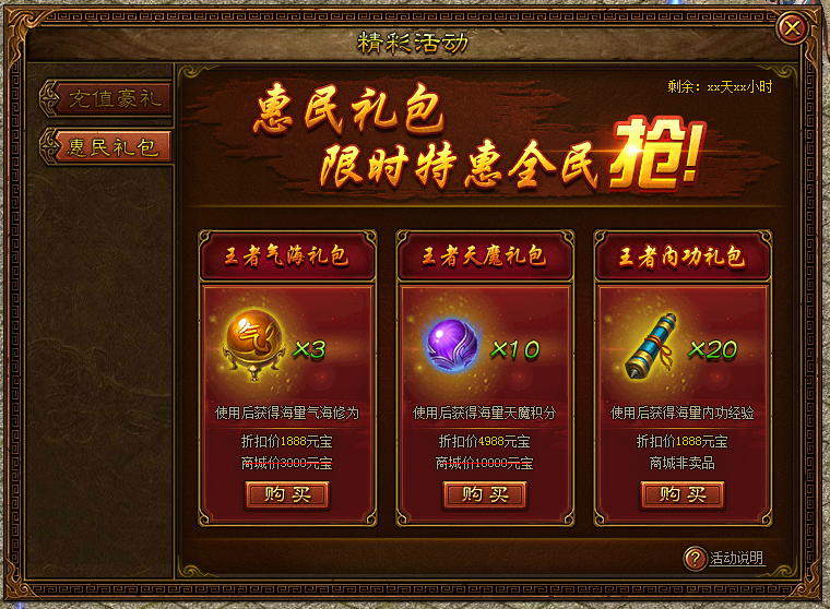 活动内容:活动期间特惠礼包共会出现3种不同的礼包,每种礼包可购买3个档次