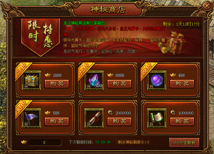 活动内容:活动期间神秘商店会刷新稀有道具,CD时间为2小时,可消耗388元宝进行刷新。