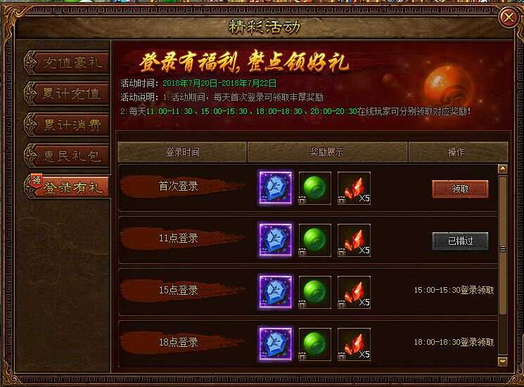 活动内容:活动期间每日首次登录以及特定时间段登录则可以免费领取奖励