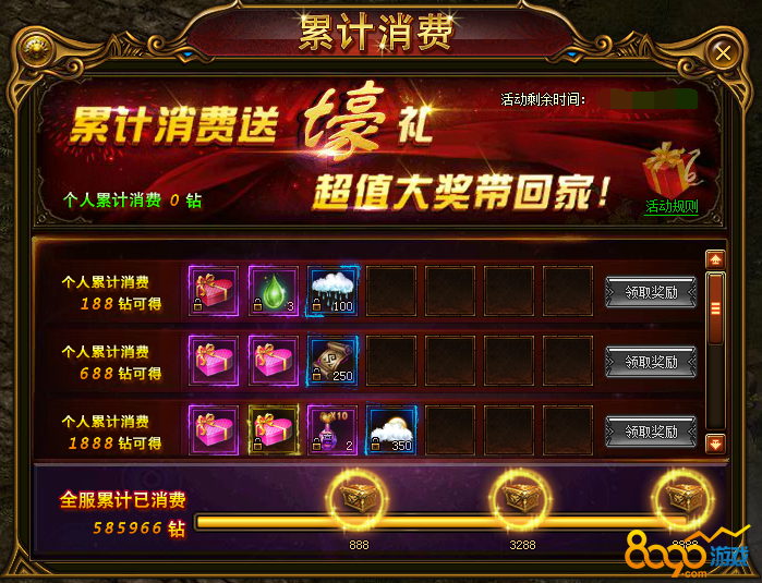 2、活动期间全服总消费每达到一定额度后,所有人均可获得一份免费大礼包。