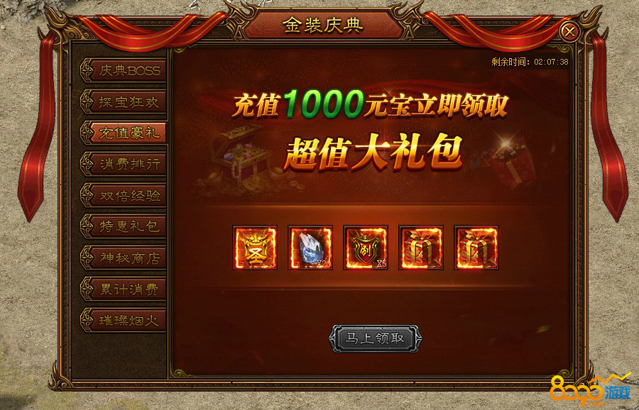 活动内容:活动期间每天充值1000元宝即可获得大量超值奖励!