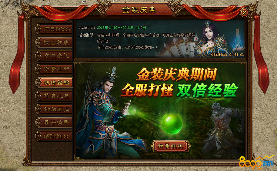 活动内容:活动期间内,全服开启双倍经验活动,玩家击杀怪物获得经验双倍!(可与经验卷轴,VIP多倍经验叠加。)