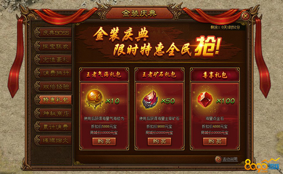 活动内容:活动期间内,特惠礼包共会出现3种不同礼包,每种礼包可购买3个档次。