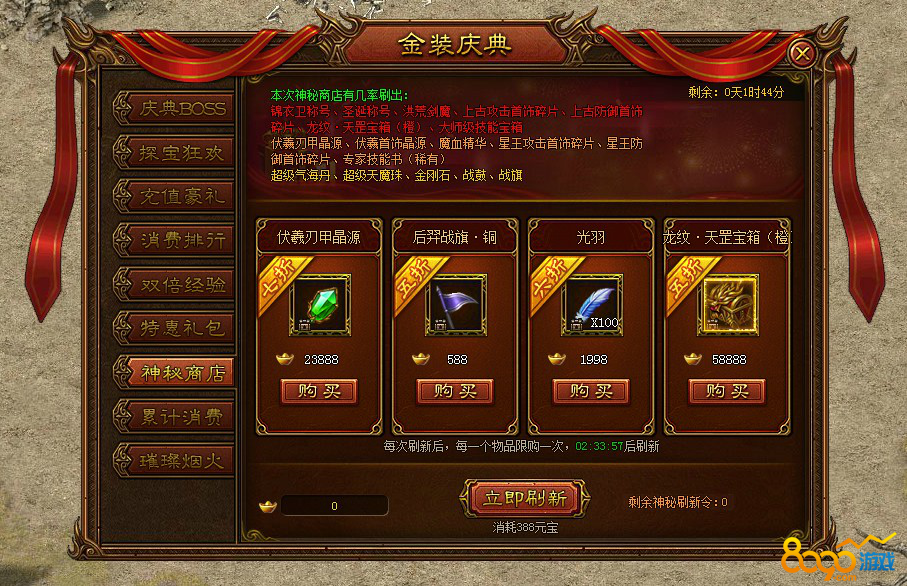 活动内容:活动期间内,神秘商店会刷新出稀有道具龙纹宝箱·橙、龙炎·橙、称号·刺客信条、冰王光翼卡、破碎·夸父武器衣服任选、主宰护膝等。